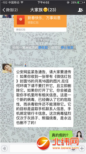 这则信息称:“公安网监紧急通告,请大家要速传!如果你收到一张带有《微信红包》封面15的月亮16圆的图片,在任何环境下请不要打开它,且立即删除它。如果你打开了它,你会被盗取你手机里所有相关信息。这是一个新的病毒,已经确认了它的危险性,而杀毒软件还不能清除它。它的目标是盗取手机联系人信息,手机绑定银行卡信息。这次病毒猛烈仅次于灰鸽子、熊猫烧香,是永远也删不了的”。