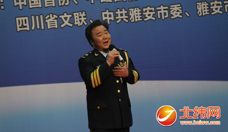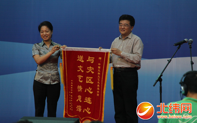 副市长徐旭代表雅安市政府向来雅慰问演出的中国文联文艺志愿服务团赠送锦旗