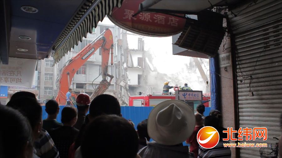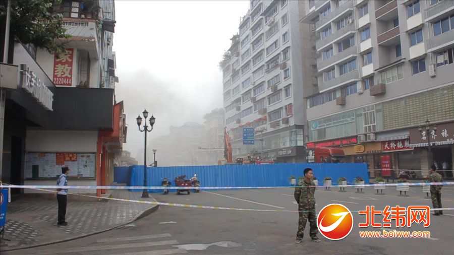 现场围着警戒线,公安、消防、医疗和城管等部门均到场待命