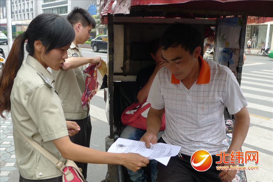 执法人员向三轮车驾驶员解释加装电瓶的危害