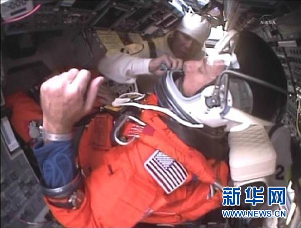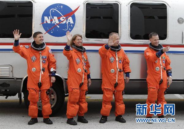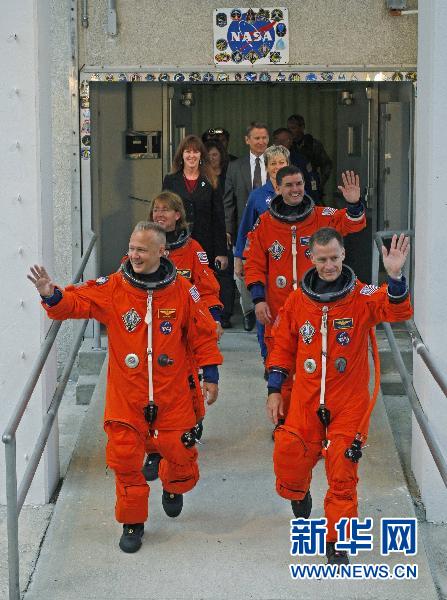 7月8日,美“阿特兰蒂斯”号航天飞机机组人员指令长克里斯·弗格森(右下)、飞行员道格·赫尔利(左下)、任务专家桑迪·马格努斯(左上)和雷克斯·瓦尔海姆(右上)在佛罗里达州肯尼迪航天中心,准备进入航天飞机发射位置。按计划,“阿特兰蒂斯”号将于美国东部时间7月8日11时26分(北京时间23时26分)升空。“阿特兰蒂斯”号此行是美国航天飞机第135次也是最后一次飞行,任务期为12天。新华社/路透
