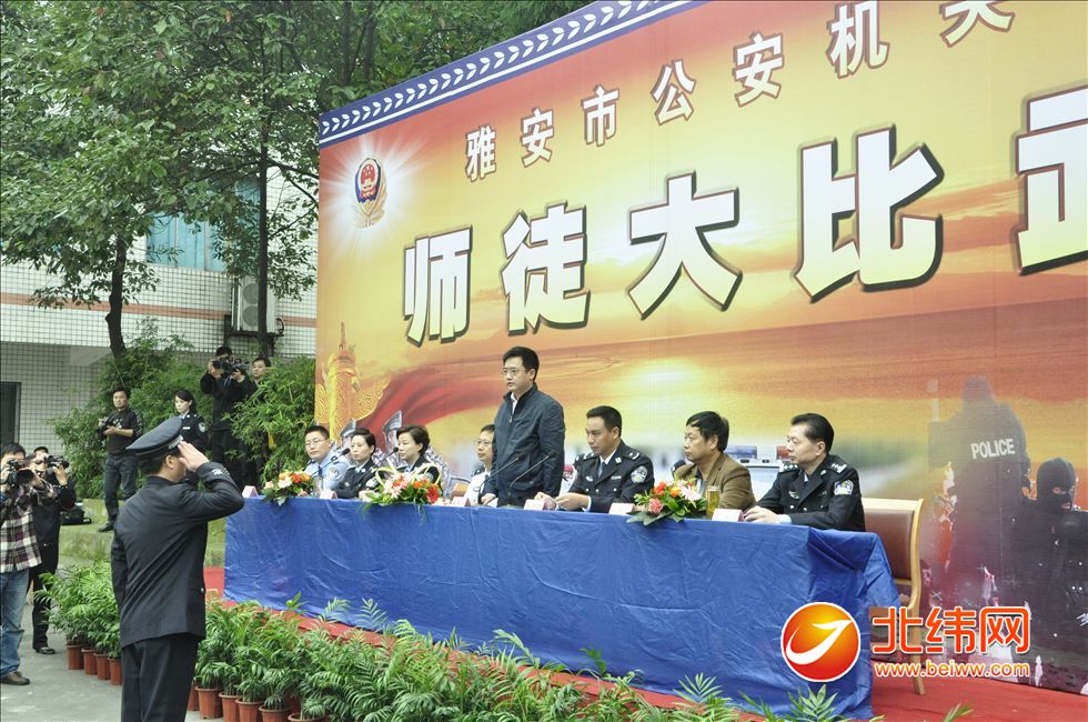 北纬网讯(记者 王博)今(10)日上午,全市公安机关“师徒大比武”竞赛活动在市公安局内举行了盛大的开幕式。市委常委、市政法委书记张燕飞,省公安厅政治部教育处处长刘波涛,市委政法委副书记吴雅明,省公安厅政治部警讯科科长李世福和市公安局在家的党委成员、各分县局领导、9支参赛代表队员及市局机关、交警支队、雨城区分局的部分民警代表一起出席了开幕式。开幕式由副市长、市公安局局长谢忠华主持。