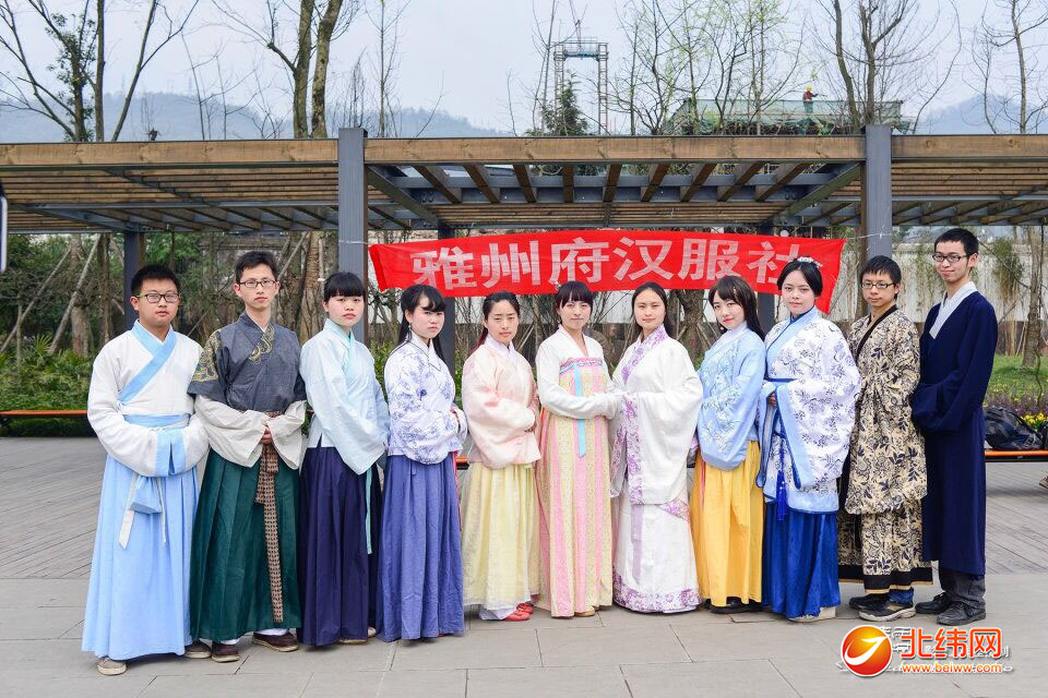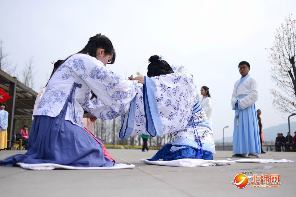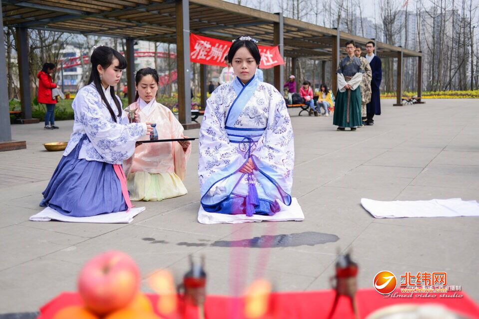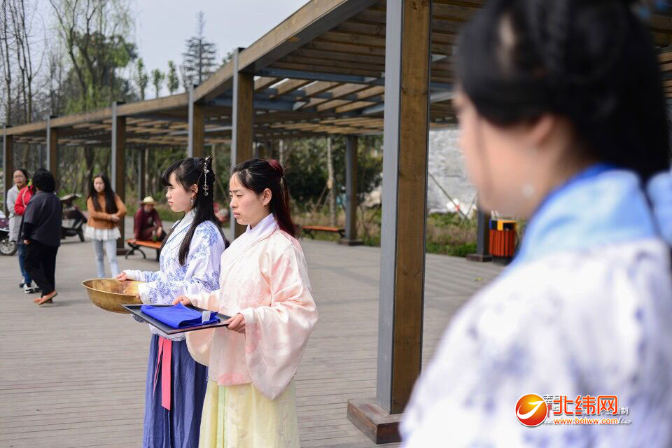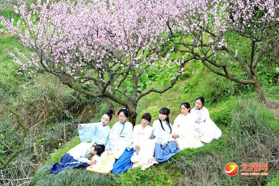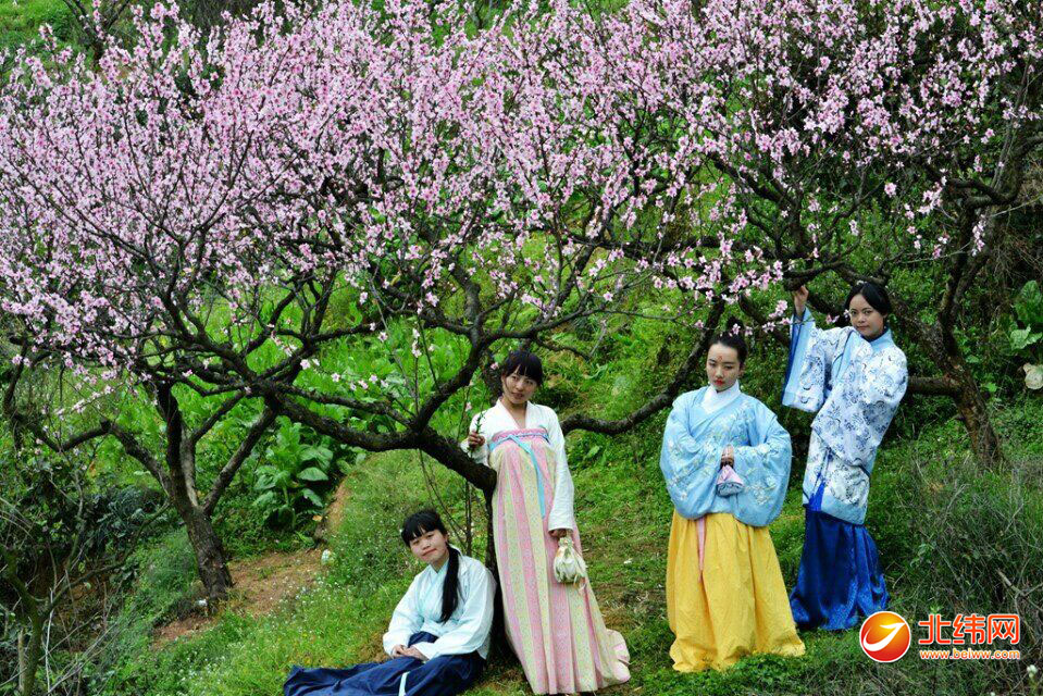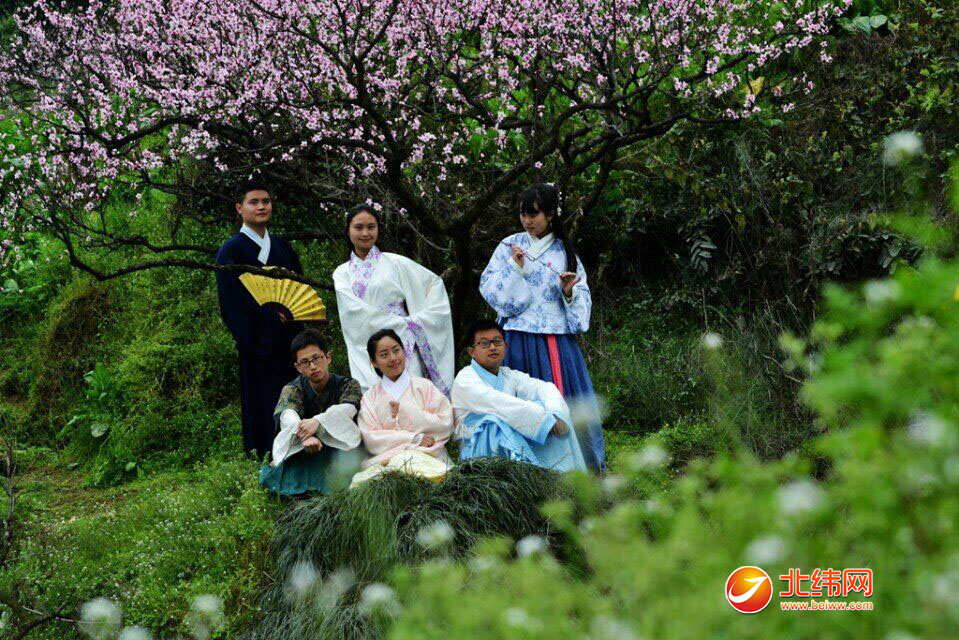 北纬网讯 (实习记者 李晓明)14日,来自雅州汉服社的一群汉服爱好者在雅安北纬30公园和桃花山举办了“花朝节”的庆祝活动。