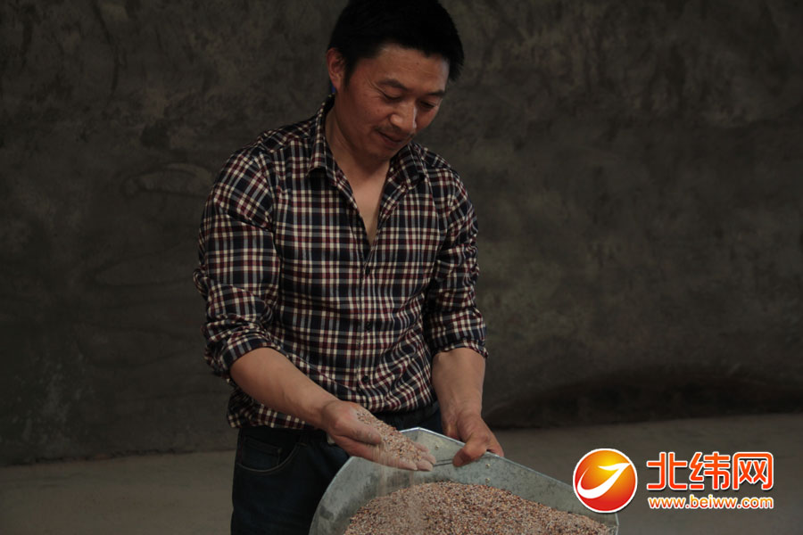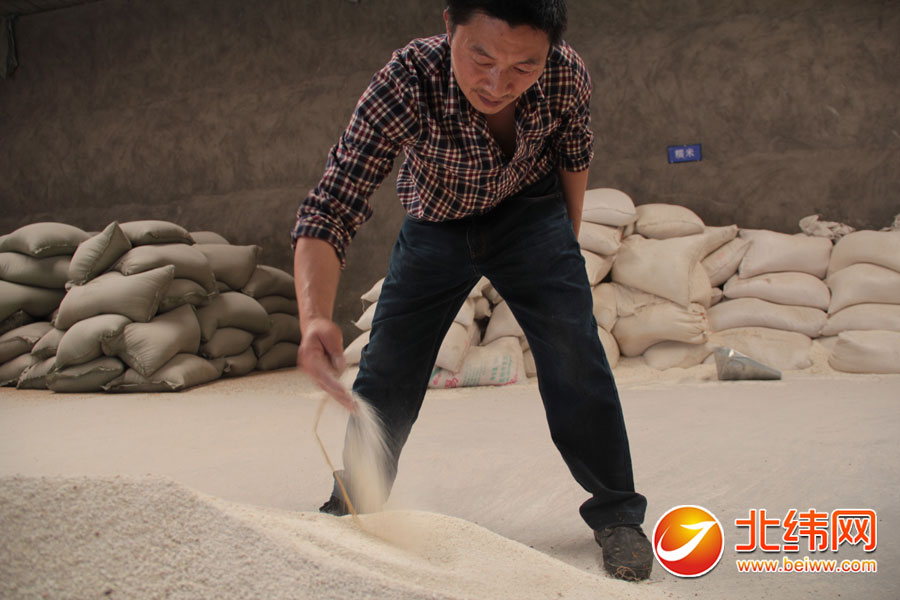 酿造白酒需要高粱、玉米、小麦、籼米、糯米物种粮食,在酿造之前,每种粮食都需要先粉碎。张福云正在检查糯米的粉碎情况。