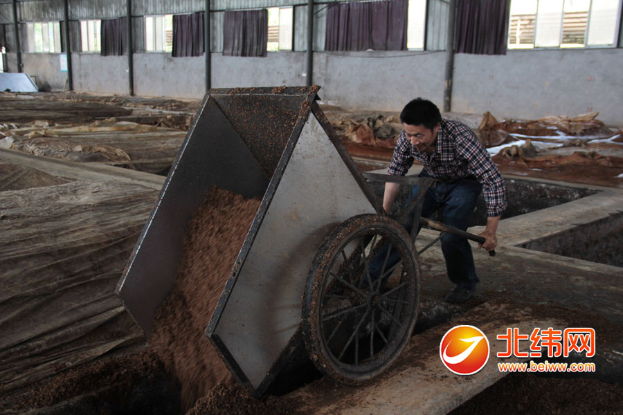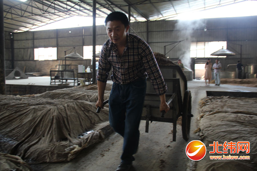 混合好粮食和发酵物后,张福云将粮食运到发酵坑。