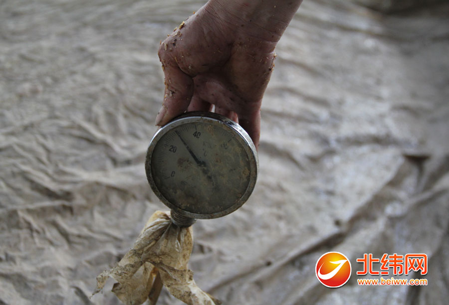 一般来说,粮食需要在发酵坑内发酵60至90天,这段时间里,张福云需要做的就是观察插入发酵坑的温度计。从20℃下坑到集聚热量至32℃再降到22℃左右,发酵的过程也就基本完成了。