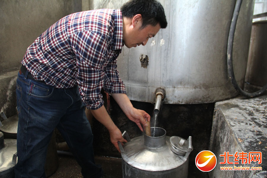 蒸馏过后,白酒就酿制出来了。头几桶白酒的浓度能达到70多度,越到后面,白酒的浓度会越来越低。