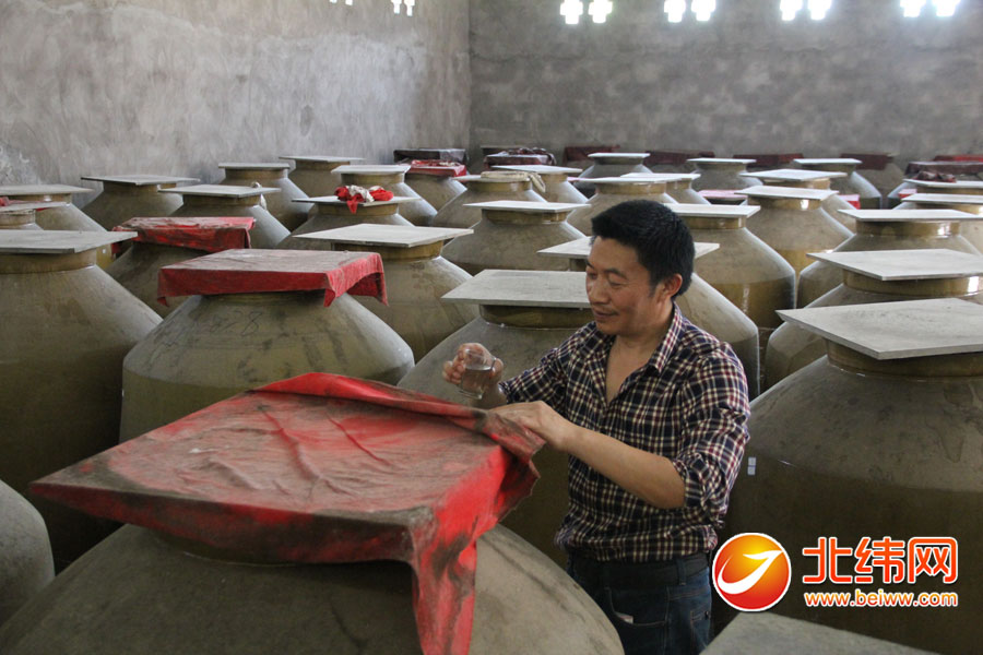 在酿造车间后面,是酒厂的酒窖,这里的陶缸酒罐一个罐子能装1吨白酒。每天张福云和同事们都会将当天酿好的白酒装到大陶缸酒罐里,至少储存一年后,才出厂售卖。