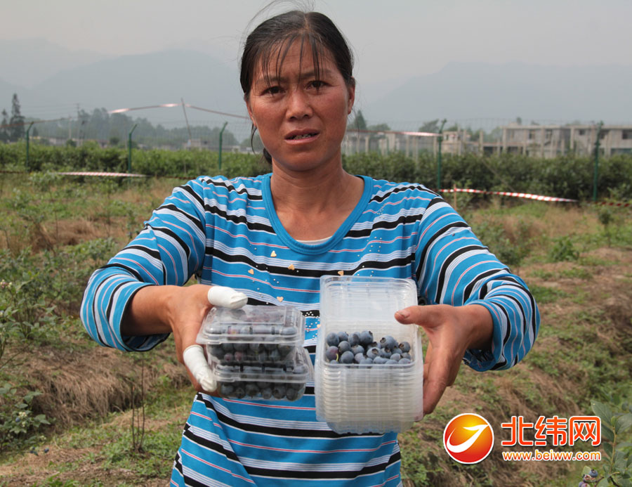 今年的天气较好,晒几天太阳后,蓝莓很快就成熟,杨世英必须抢抓时间将成熟的蓝莓采摘下来。