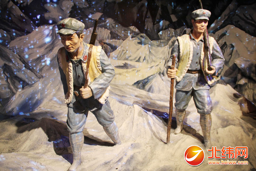 纪念馆内,模拟红军翻越夹金山场景的雕塑