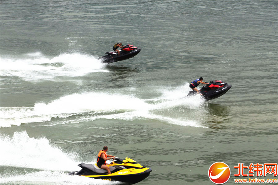 汉源湖面马达轰鸣、浪花飞溅。当日上午,伴着汉源的青山绿水,以及观众的阵阵喝彩,水上运动选手驾驶的摩托艇如离弦之箭,在平静无波的汉源湖面上来去如飞,做出了各种惊险又刺激的高难度动作:有的顺着波浪做起了“青蛙跳”;有的摩托艇在湖中来了个360度的大转弯,艇尾甩出一个个白花花的水浪。之后,几位靓丽的泳装模特搭乘上摩托艇与选手们一起驰骋在湖面,美女与帅哥相互搭配,将整场表演推向了高潮。