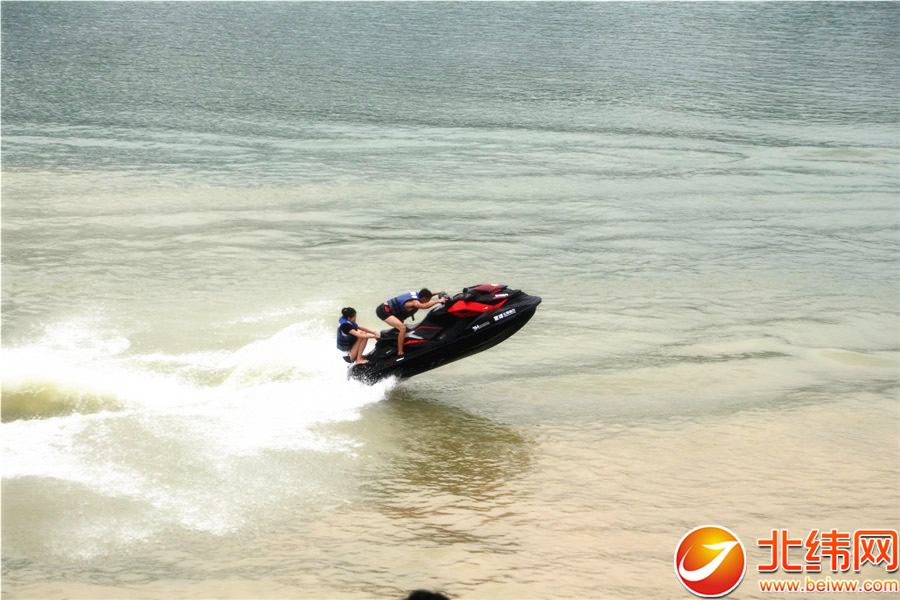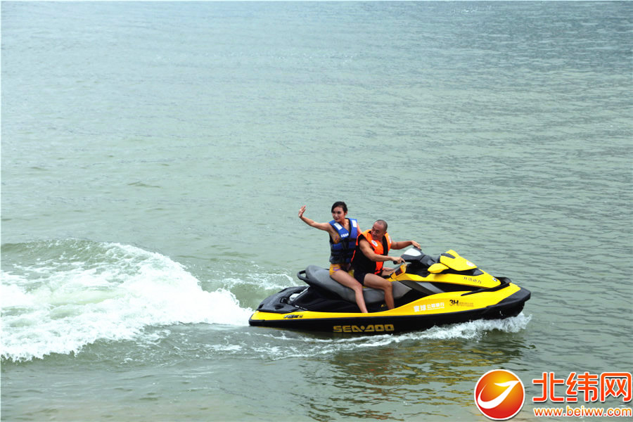 几位靓丽的泳装模特搭乘上摩托艇与选手们一起驰骋在湖面,美女与帅哥相互搭配,将整场表演推向了高潮。