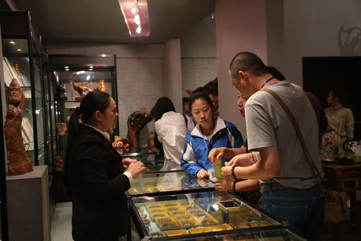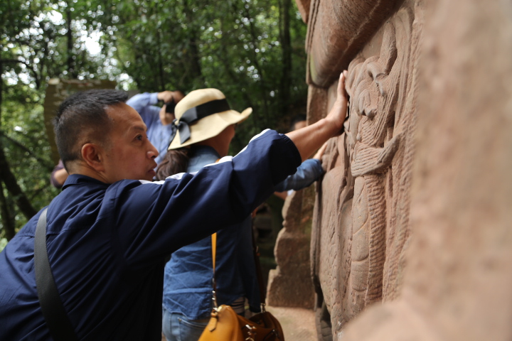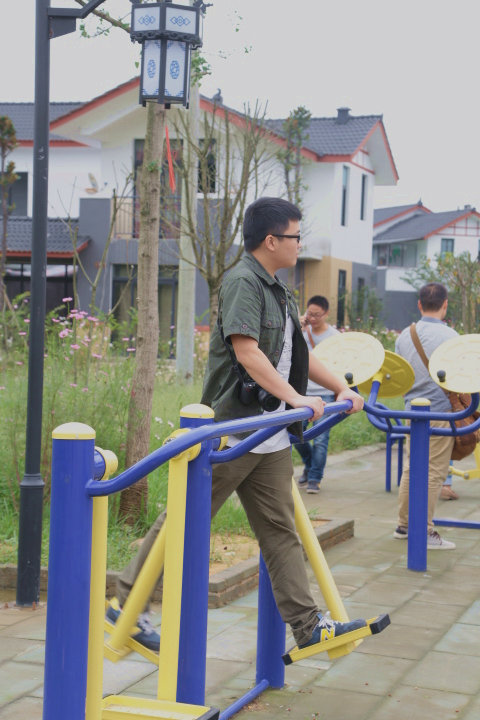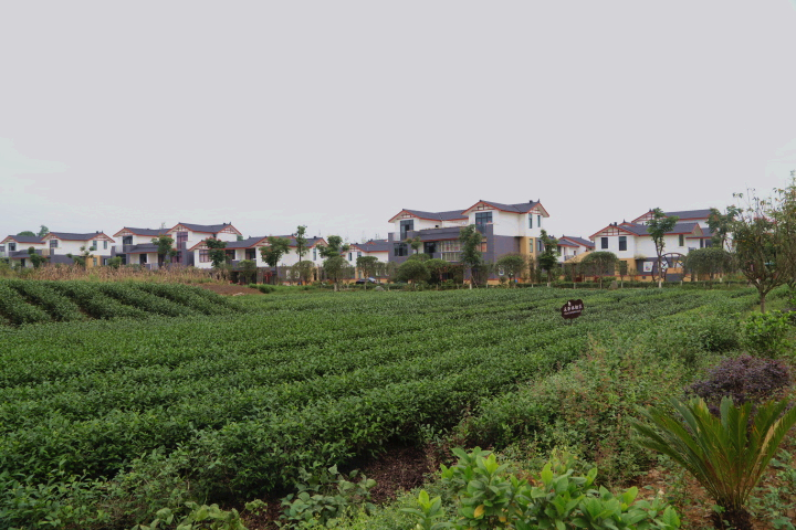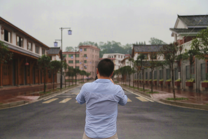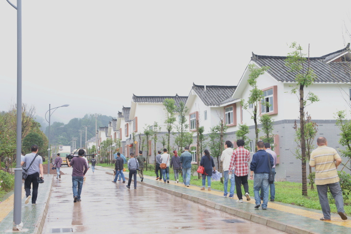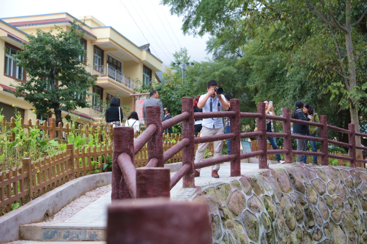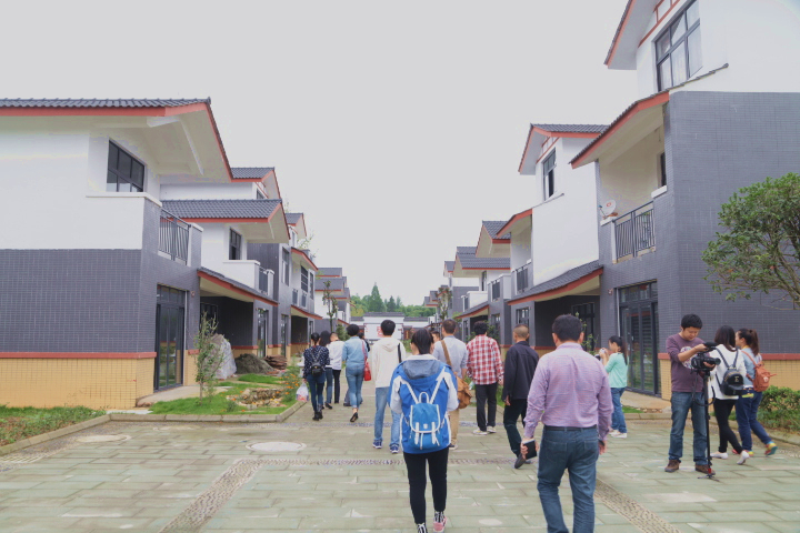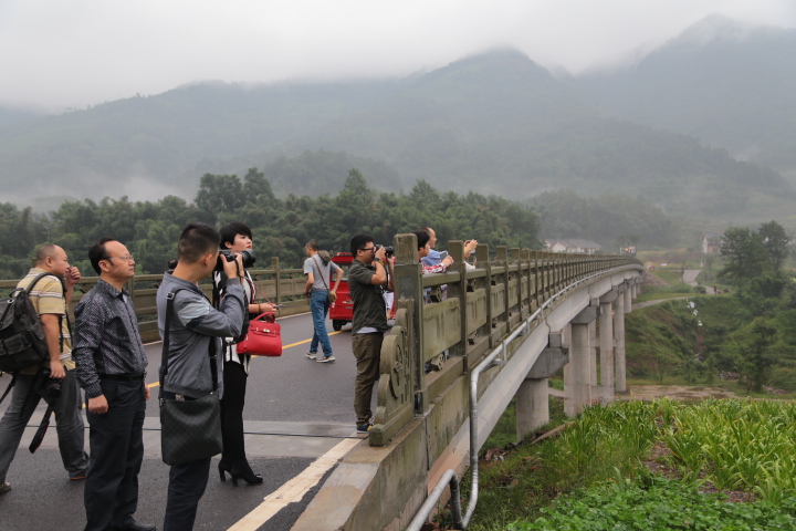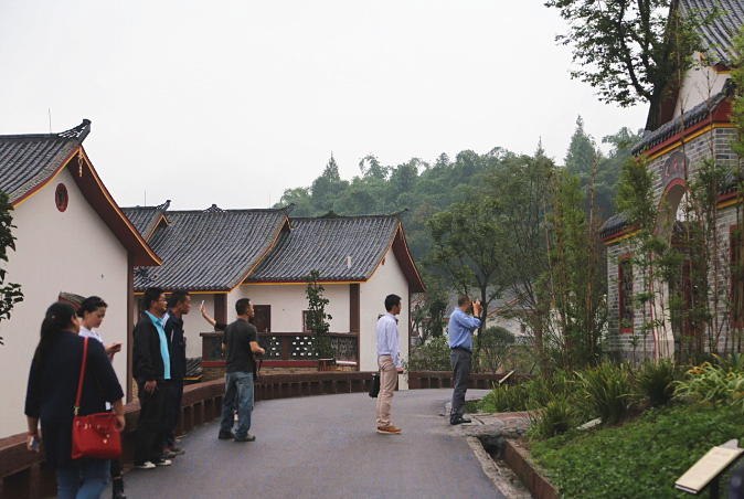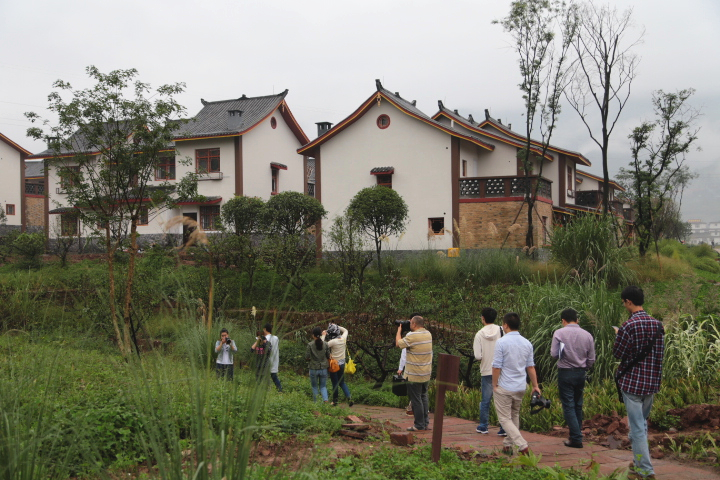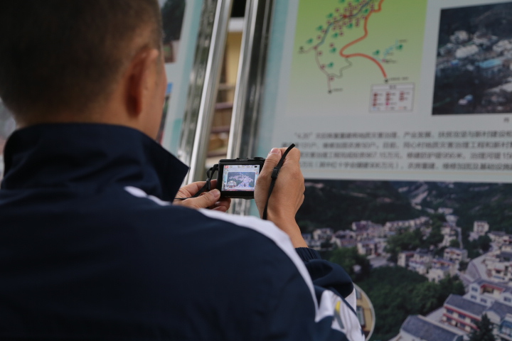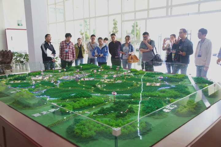 媒体团的记者们在看名山茅河乡临溪新村旅游发展规划沙盘
