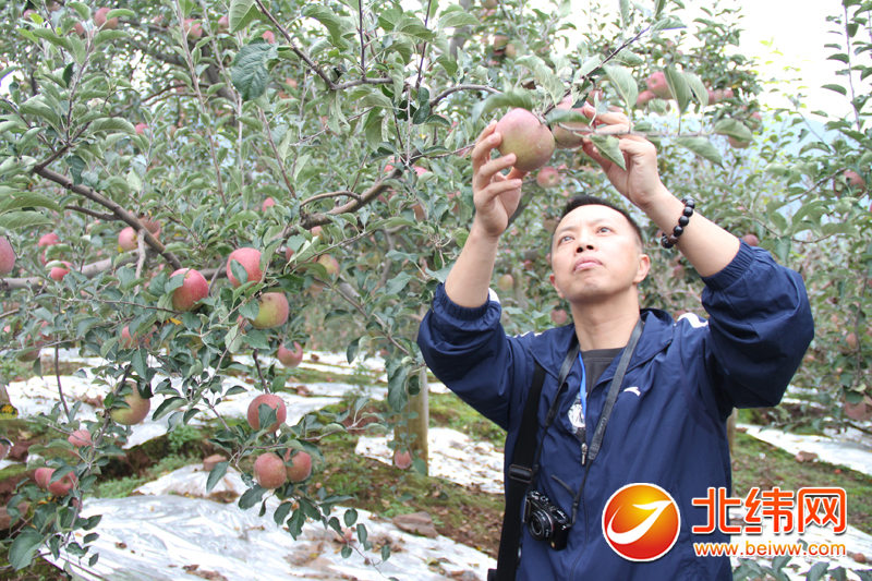 媒体嘉宾在汉源县大田乡苹果园里体验采摘乐趣