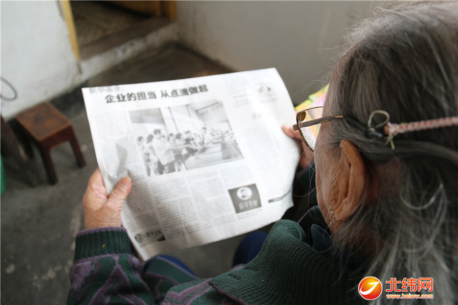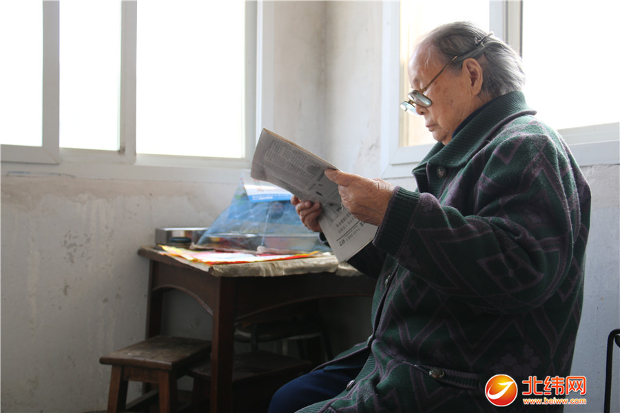 朱含英老人每天都要看看报纸,了解外面的世界。