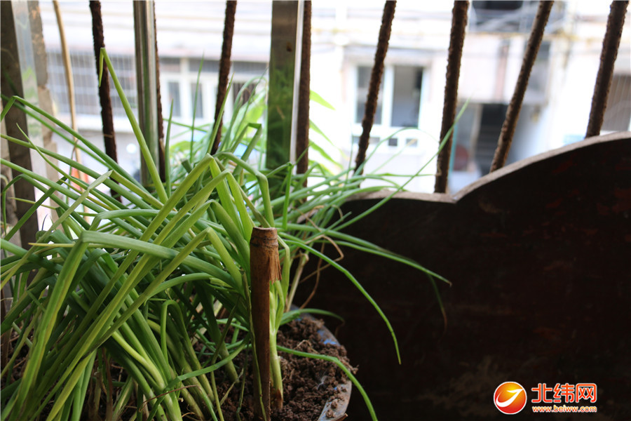 闲来无事,朱含英老人把儿女们拿来的葱种在花盆里,阳台上也有了一抹绿色。