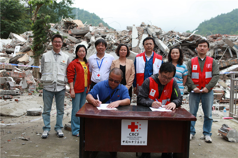 2013年5月,中国红十字基金会副理事长孙硕鹏与芦山县红十字会常务副会长张平签订援助协议书