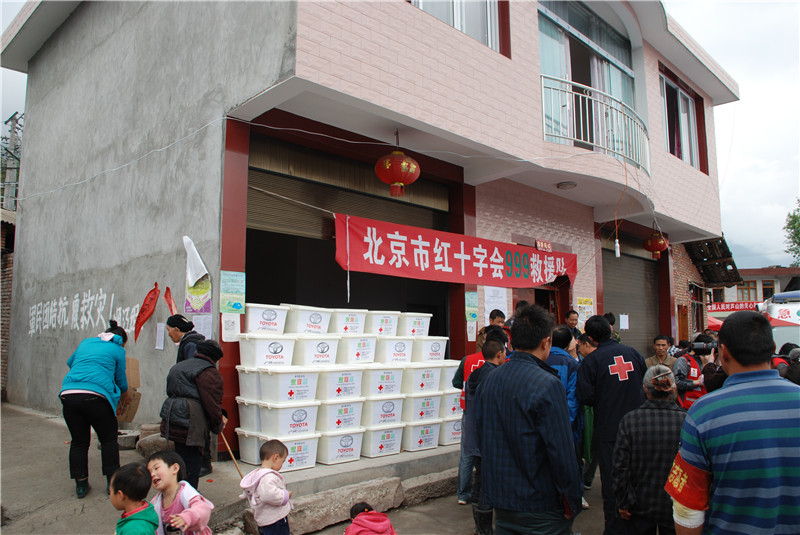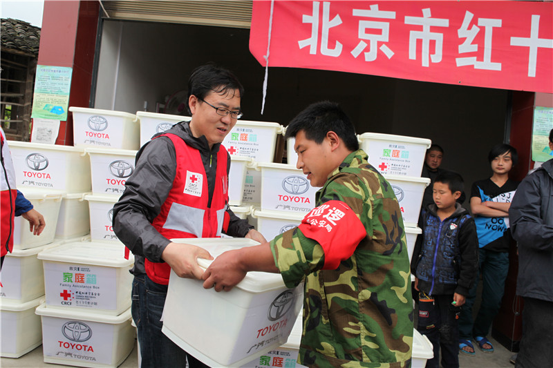 2013年5月2日,北京市红十字会999应急救援队为灾区群众发放家庭箱