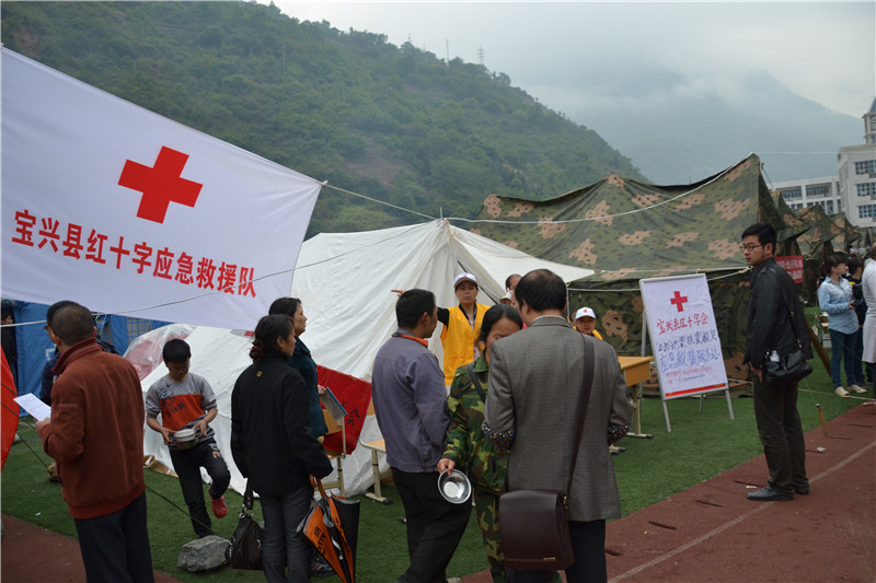 2013年4月20日,宝兴县红十字会在地震当天组织县红十字应急救援队为受灾群众提供服务