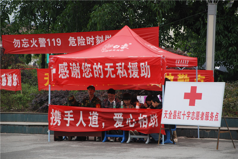2013年4月30日,天全县红十字志愿者服务点为灾区群众和救灾人员提供志愿服务