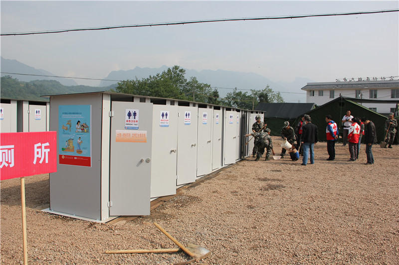 2013年5月4日,云南省红十字会大众卫生救援队为芦山地震灾区搭建的应急卫生厕所