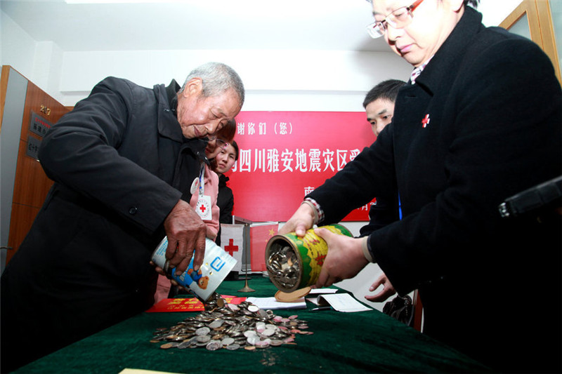 江苏省南通市磨刀老人将积攒的2000元硬币全部捐赠给灾区