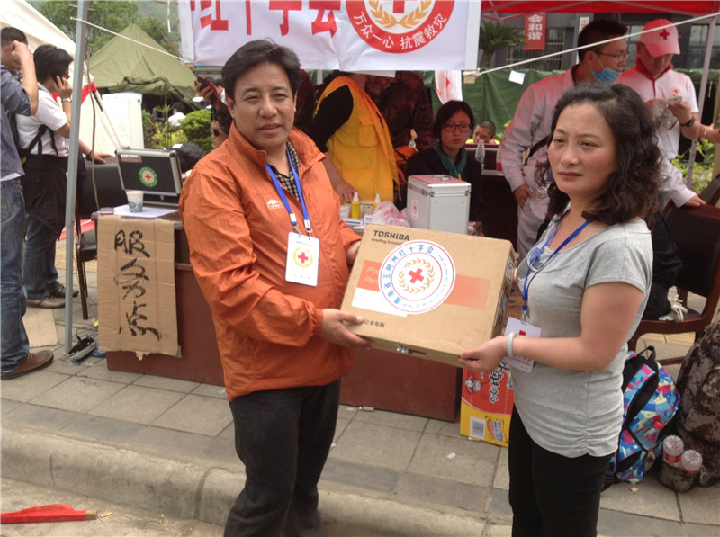 地震发生后,红十字会立即启动应急预案,一方面要求各县区红十字会参与救援;另一方面,迅速启动社会救援体系平台,积极呼吁社会各界积极行动起来为灾区捐款捐物。