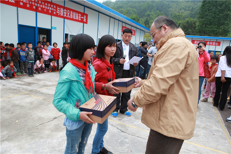2013年5月8日,北京体育大学社会体育系主任张健为芦山县龙门乡隆兴中心校孩子们发放体育用品