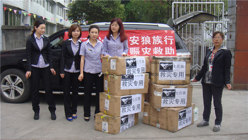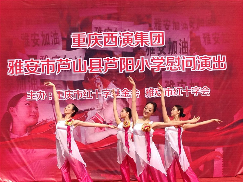 2014年5月28日,重庆西演集团总裁杨帆带领45人演出团队,为芦山县芦阳小学师生进行专场慰问演出,并现场为孩子们发放了书包、羽毛球拍、等学习和体育用品。(芦山县红十字会供图)