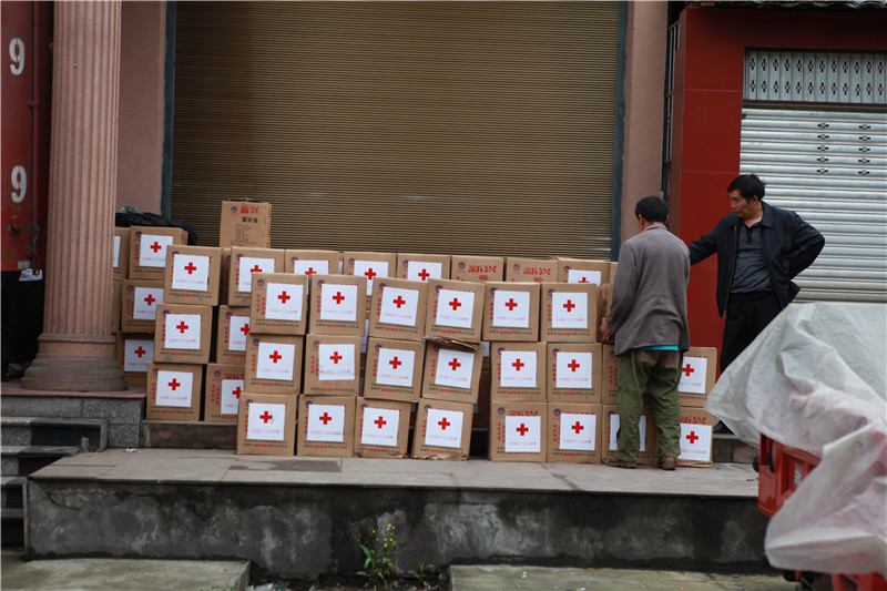2013年5月9日,芦山地震受灾乡镇组织发放中国红十字会援助救灾物资