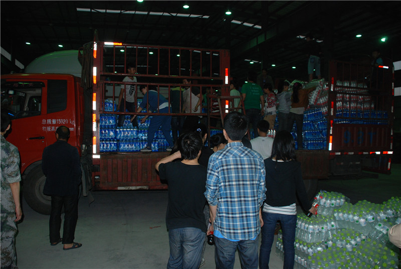 2013年4月23日,红十字志愿者在雨城区多营镇连夜帮助搬运救灾物资