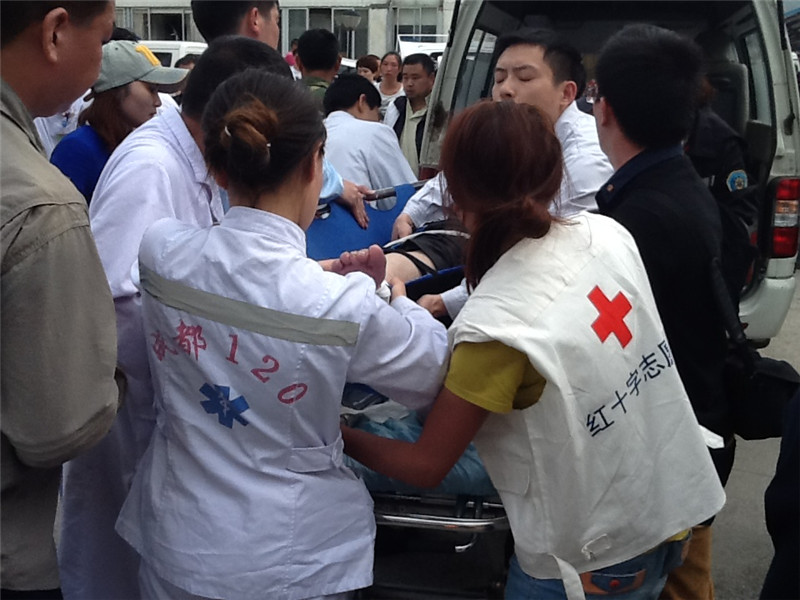 2013年4月21日,成都红十字志愿者为灾区群众提供医疗援助