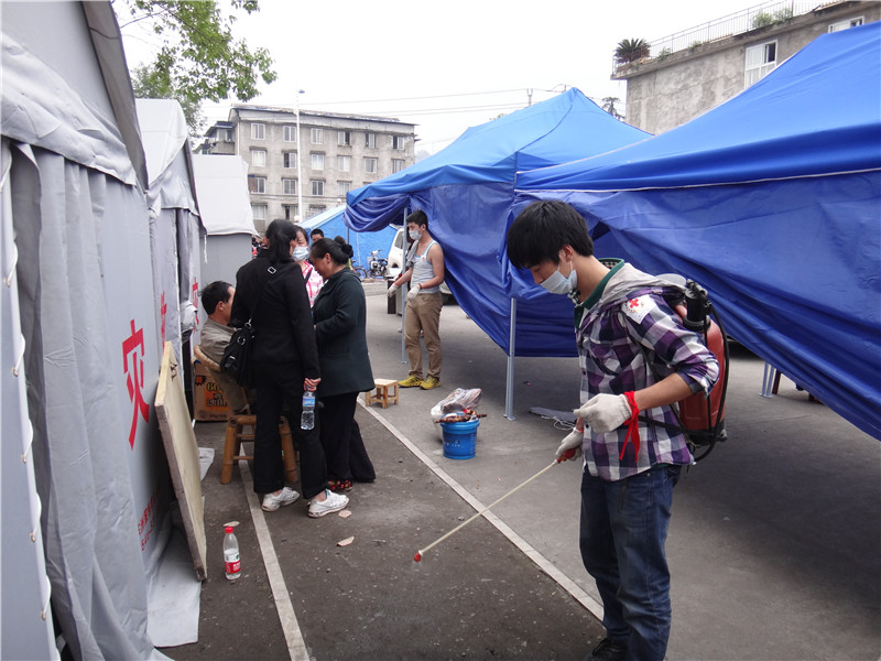2013年4月21日,红十字志愿者在芦山地震灾区帮助进行消杀工作