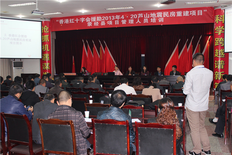 2013年10月17日,香港红十字会援助民房重建项目荥经县项目管理人员培训会在荥经县政府二楼会议室召开。香港红十字会项目经理、助理以及工程技术人员主讲。(荥经县红十字会供图 高岳 摄)