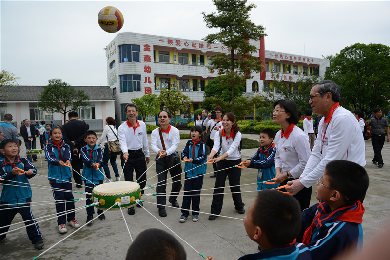 2014年4月,台湾红十字组织回访项目学校,与师生课间互动(雅安市红十字会供图)