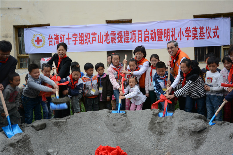 2014年4月18日,台湾红十字组织芦山地震援建项目启动暨明礼小学灾后重建奠基仪式在宝兴县明礼乡小学举行。图为台湾红十字组织会长王清峰等与学校师生共同为援建的教学综合楼奠基。(宝兴县红十字会供图)