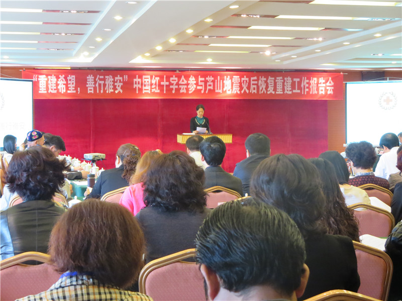 2014年4月22日,“重建希望,善行雅安” 中国红十字会参与芦山地震灾后恢复重建工作报告会在雅安倍特星月宾馆举行(雅安市红十字会供图)