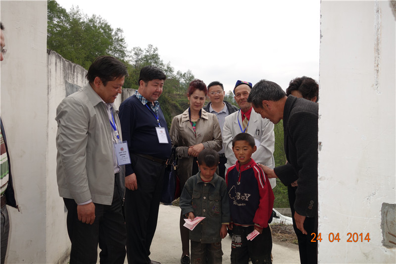 2014年4月24日,在“4.20”芦山地震一周年之际,新疆维吾尔自治区红十字会常务副会长艾买提江•依达伊吐拉(左二)及部分捐赠人代表,回访援建的宝兴县五龙乡东升村红十字博爱小学。图为一行人慰问暂借民房上课的师生。(宝兴县红十字会供图 范阳 摄)