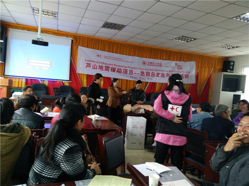 2014年11月12日,红十字会与红新月会国际联合会、雅安市红十字会在天全县新华乡为村民开展芦山地震援助项目-急救包发放与救护知识和技能培训(雅安市红十字会供图)