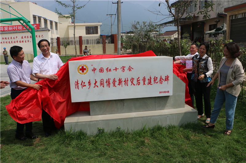 2015年6月16日,在中国三星援建芦山县清仁乡大同博爱新村竣工仪式上,中国红十字会副会长王汝鹏(左二)、中国三星副总裁王幼燕(右一)等为纪念碑揭牌(雅安市红十字会供图)