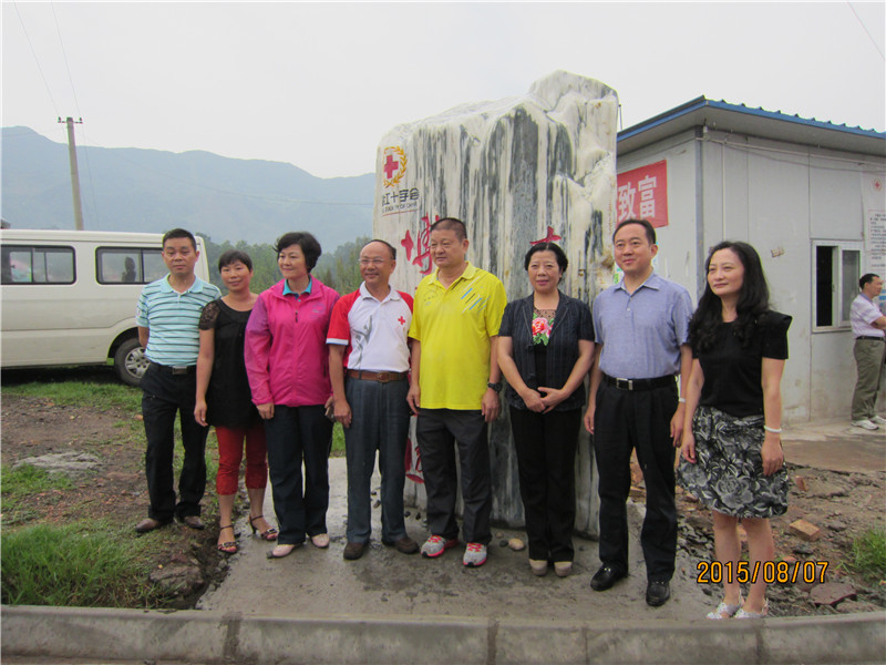 2015年8月7日,广东省红十字会回访雨城区碧峰峡镇七老村红十字博爱家园,在灾后重建纪念碑前合影留念(雨城区红十字会供图)