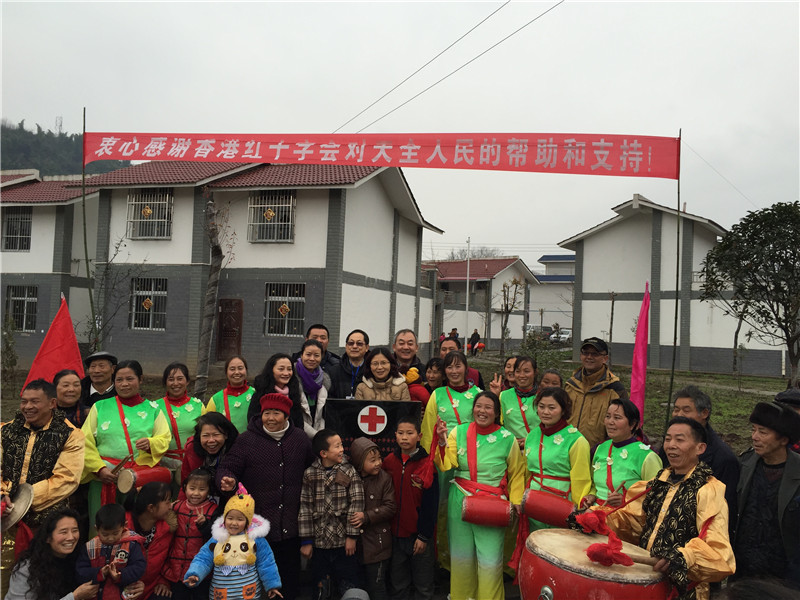 2016年1月,香港红十字会参加天全县新华乡落改村重建户聚居点揭碑仪式,落改村村民通过感恩横幅和文艺表演感谢香港同胞的无私援助。(天全县红十字会供图)